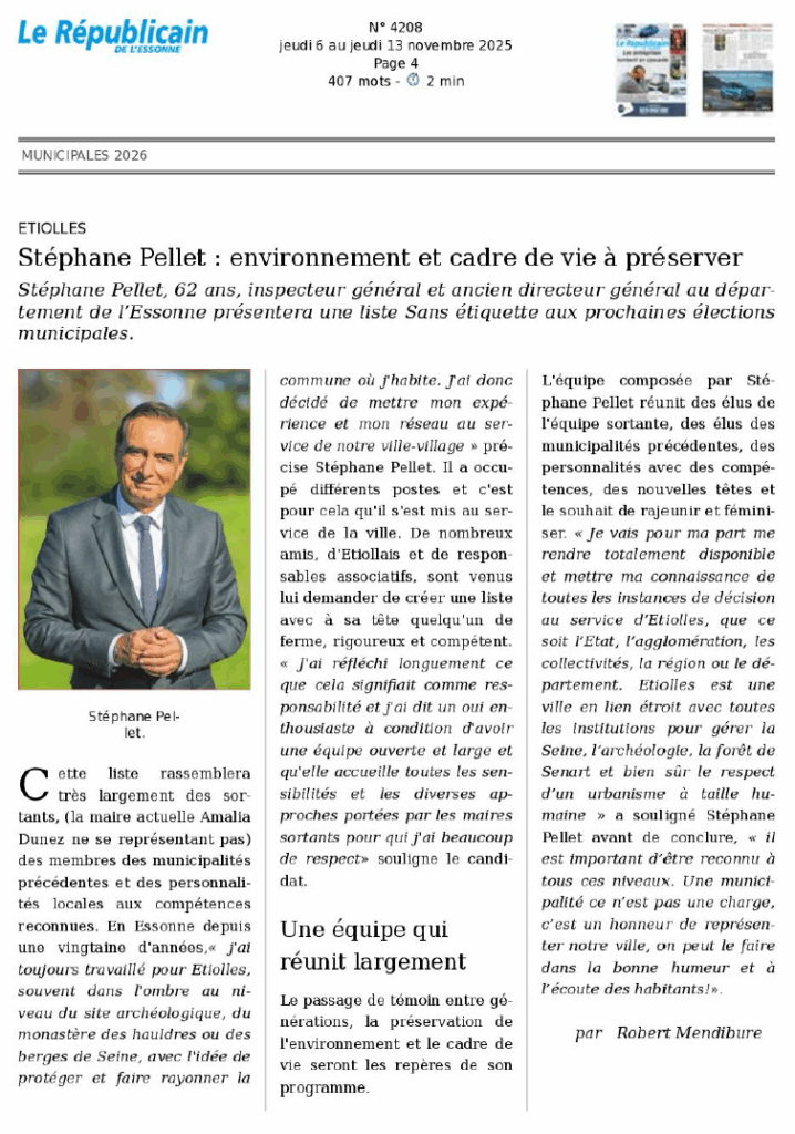 Notre tête de liste, Stéphane PELLET, met au service d’Étiolles son expérience d’inspecteur général et d’ancien directeur général au Département de l’Essonne.