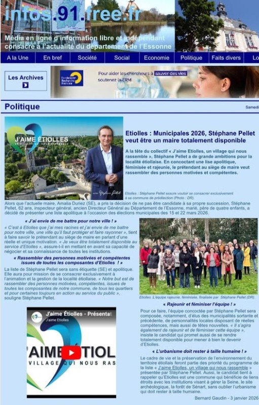 À l’approche des élections municipales du 15 mars 2026, la liste J’aime Étiolles, conduite par Stéphane PELLET, affirme une ambition claire : rassembler les Étiollais autour d’un projet sérieux, efficace et tourné vers l’avenir. « Je conduis une liste de rassemblement qui réunit trois générations : des personnes en fin de carrière et retraitées, d’autres […]