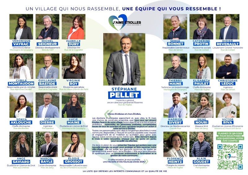 Depuis 5 mois, Stéphane PELLET va à la rencontre des habitants, foyer par foyer, prenant le temps d’échanger, d’écouter les préoccupations et les idées de chacune et chacun. À chaque passage, il laisse ses coordonnées, afin de permettre à tous les Étiollais de le contacter librement et de poursuivre le dialogue.